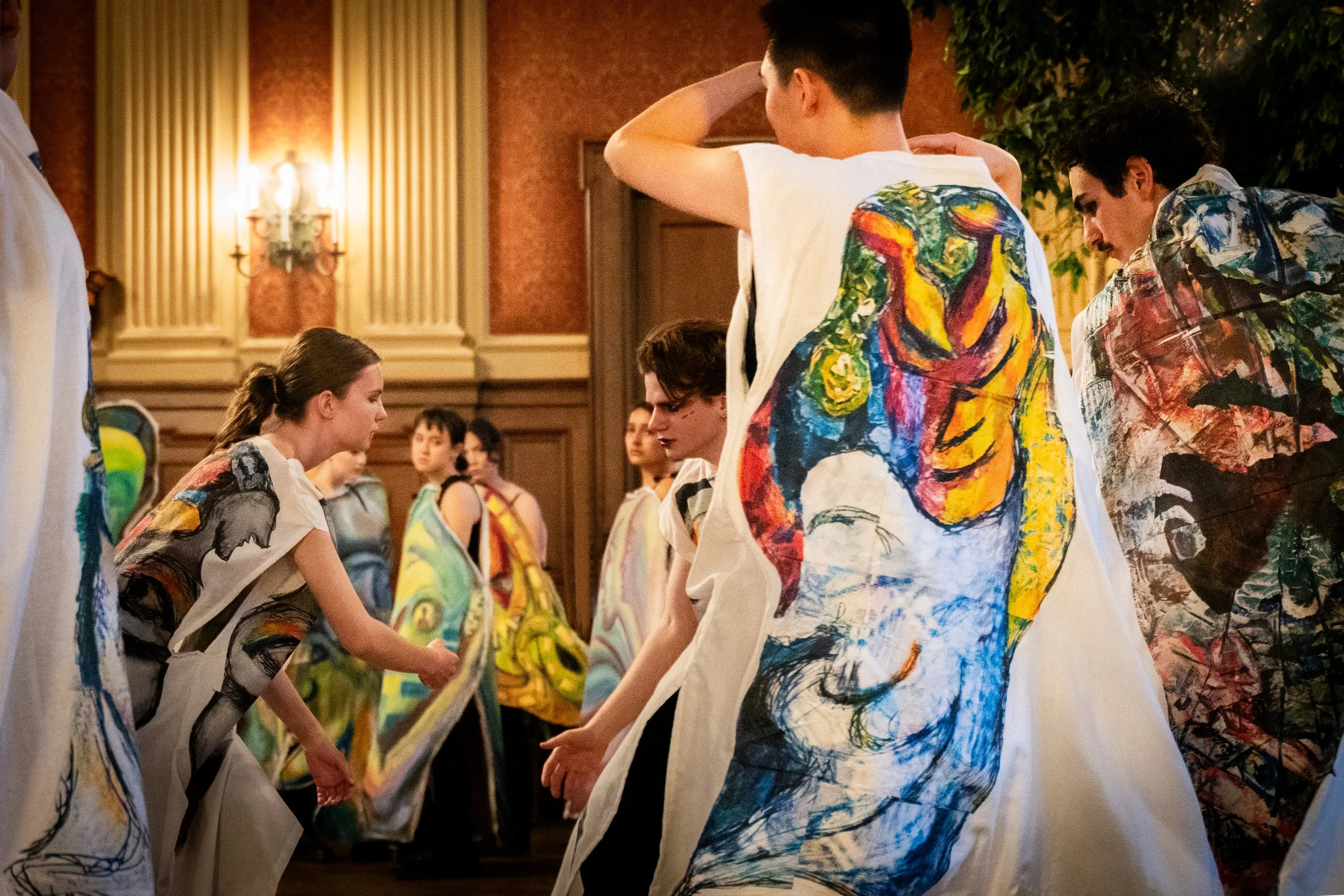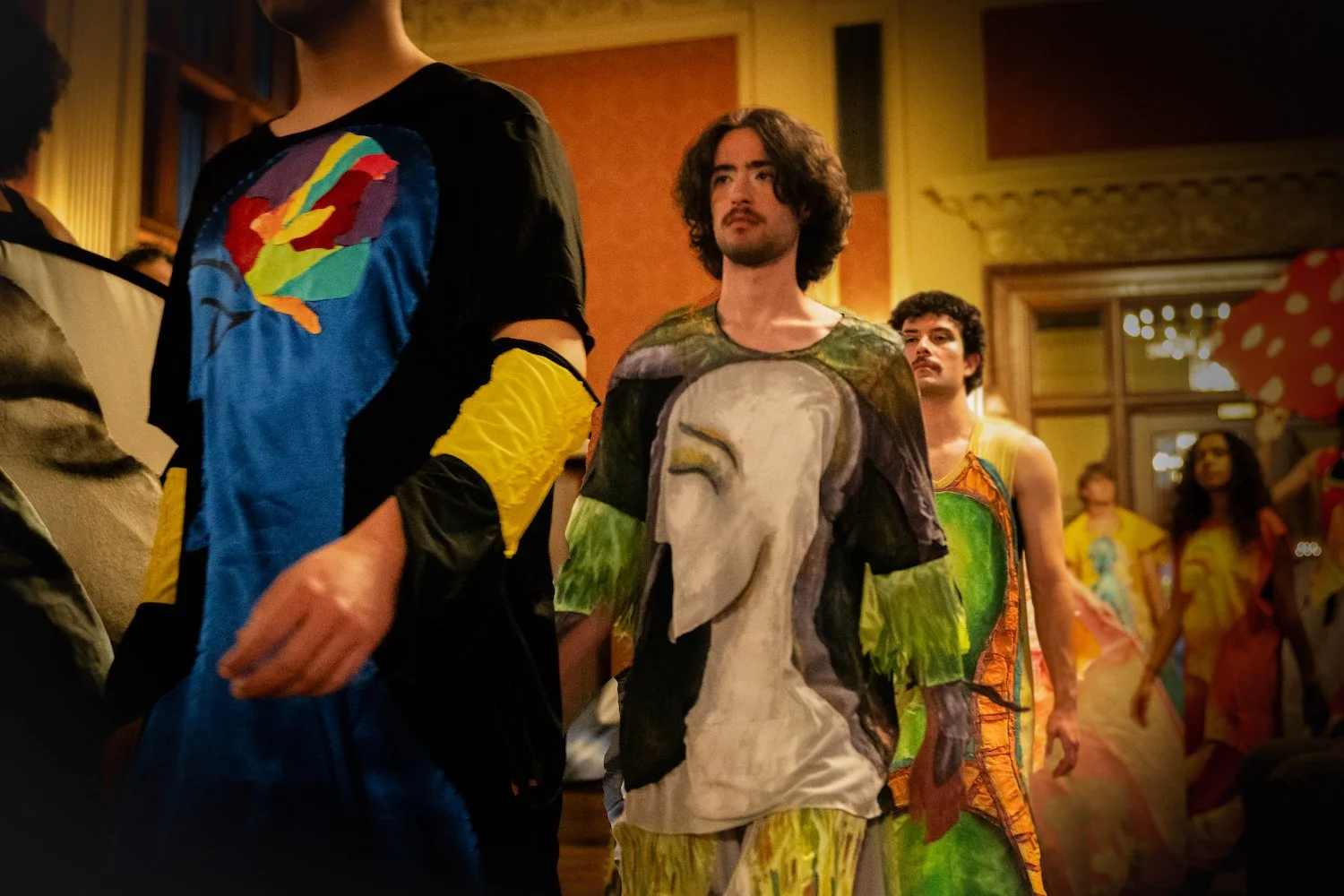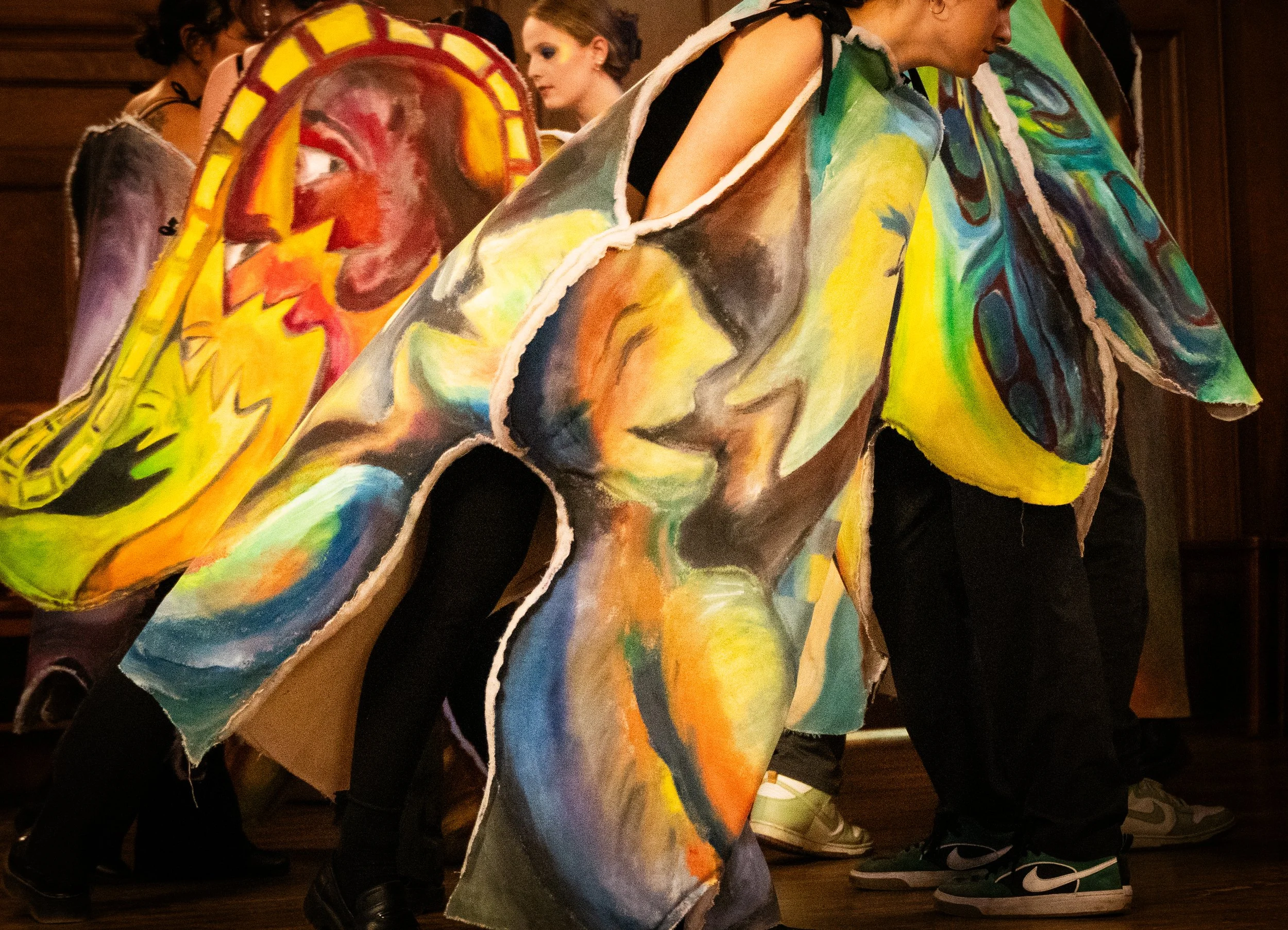 As soundscapes began to play, performers slowly came to life—first moving within themselves, then gradually noticing others. They formed 7 shifting groups, each exploring the themes of their garments through guided movement motifs. Eventually, these groups dissolved and reformed in a more improvisational exchange, as performers crossed paths, traded gestures, and responded to one another in real time.