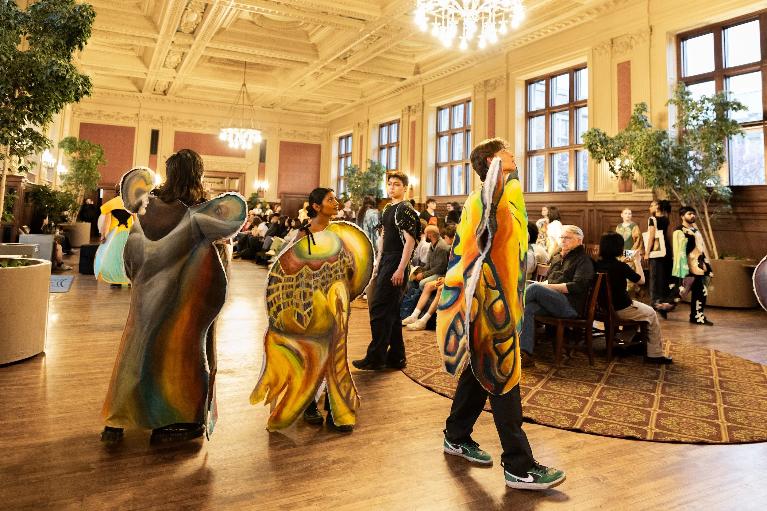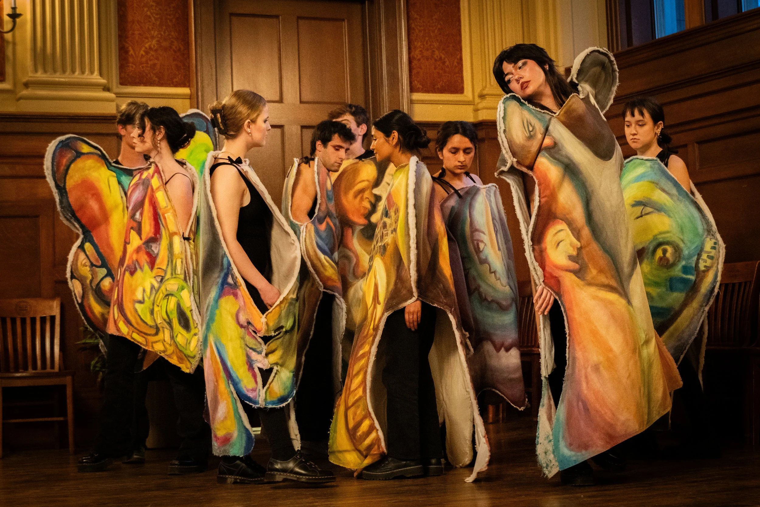 Set in the historic Holmes Lounge at Washington University in St. Louis, the audience entered a grand hall where performers froze in place, each in their own emotional world. Chairs lined the hall in a single, long back-to-back row through the center, allowing the audience to be surrounded by the performers.