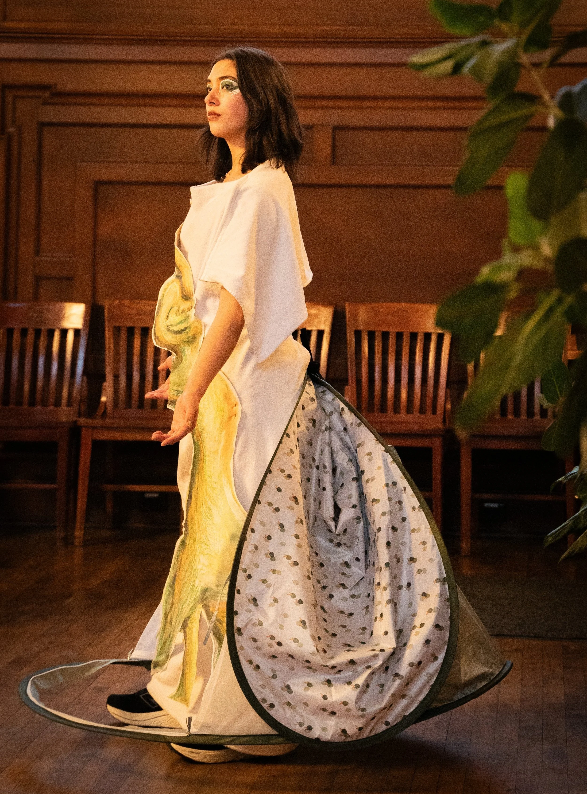Exchanging Footsteps unfolded as a live multimedia performance combining wearable art, movement, and original soundscapes to explore what it means to find home in unfamiliar places, and how connection can help us heal from grief, separation, and trauma. The piece was created in collaboration with RECLÉM, an environmentally conscious fashion studio founded by Professor Mary Ruppert-Stroescu. 52 wearable pieces were featured in the event, 38 were by artist Bei Qi, 3 were collaboration garments, and 11 created by Professor Ruppert-Stroescu.