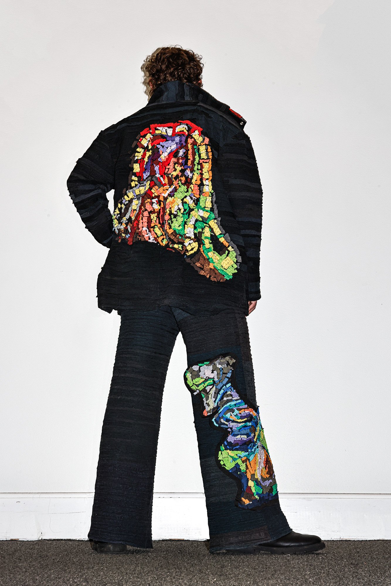 This editorial shoot showcases Trace, a collaborative project between Dr. Mary Ruppert-Stroescu’s brand RECLÉM and Bei Qi’s Human Revelations series. In this collaboration, Qi reimagined her wearable paintings as textile collages using thrifted and repurposed fabric. These collages were then integrated into Ruppert-Stroescu’s sustainable streetwear designs through detailed stitching and garment construction.